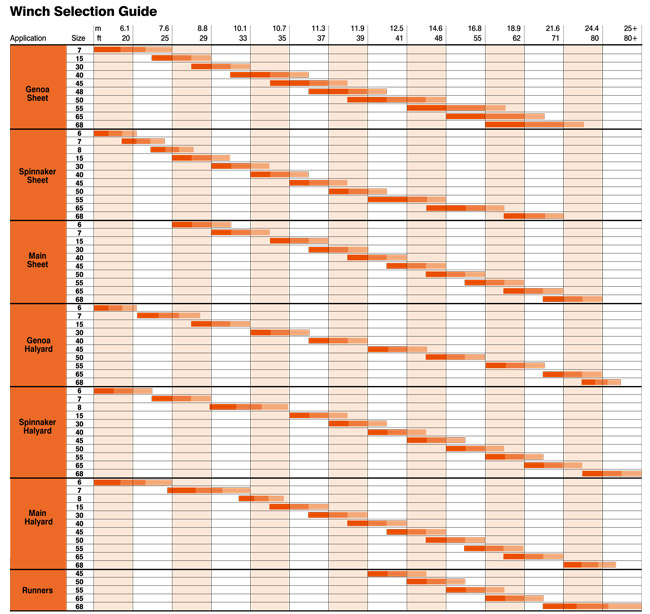 When you're deciding on the correct size winch for controlling your headsails, use the sail area of the working jib or the 100% genoa. The smaller sail may seem like an odd choice, but bear in mind that it's used in heavier winds, so the sheets are subjected to higher loads. You can clearly see this by taking a look at the formula for load:
